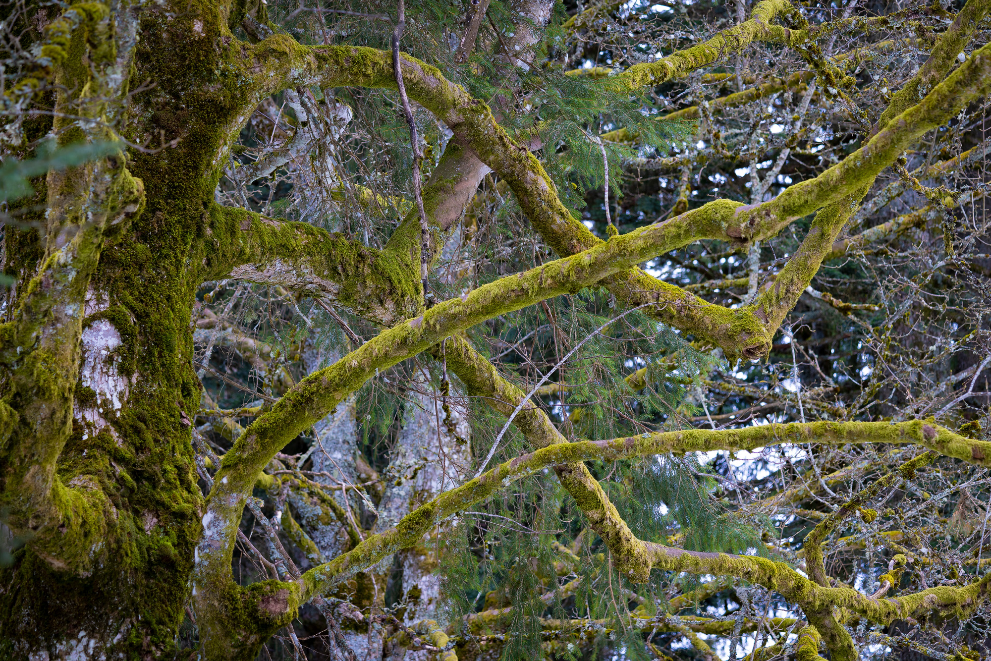 Here is close-up view of a moss-covered tree in a forest near the “Montagne de Cernier”.